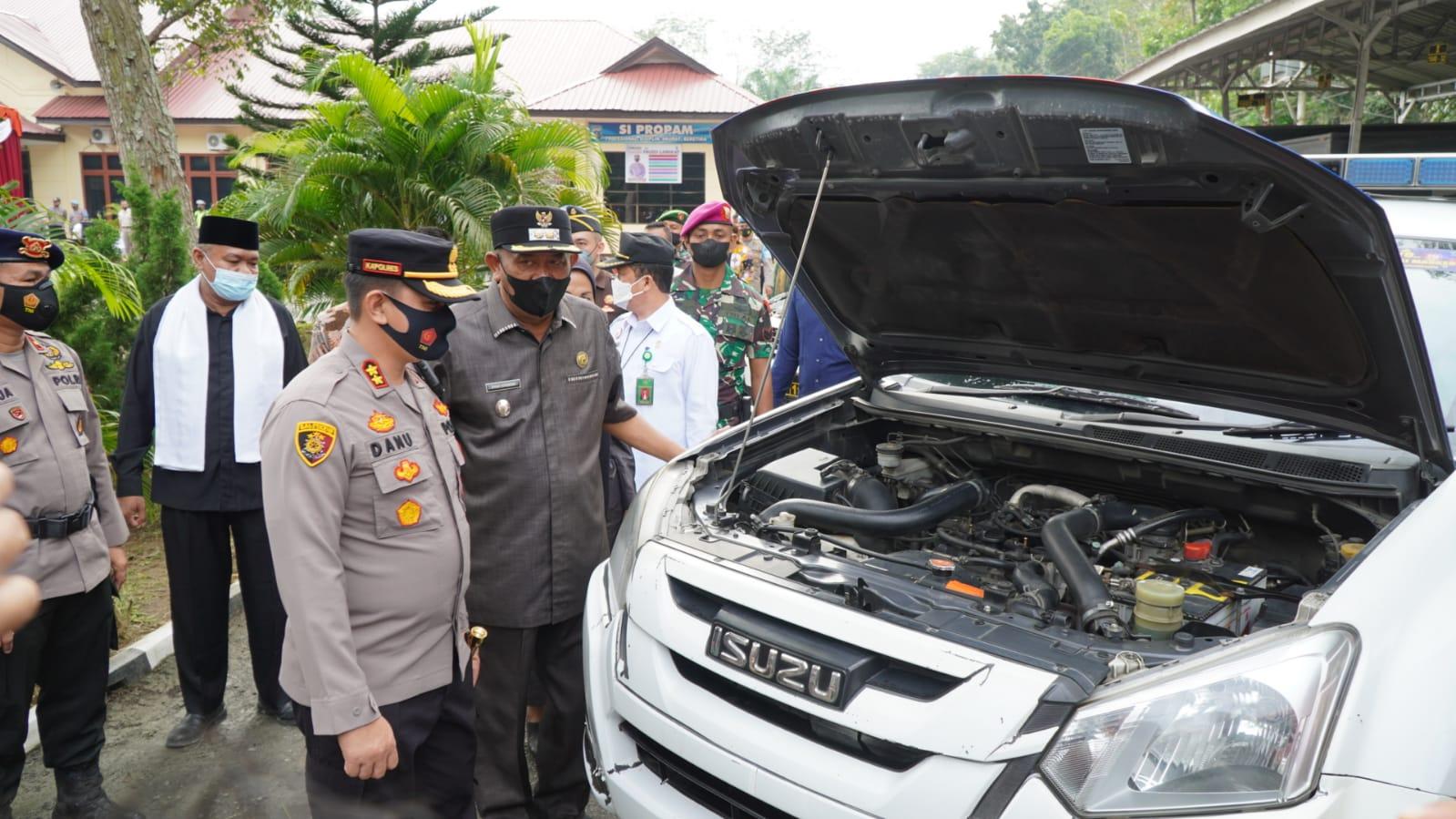 Apel ditandai penyematan pita oleh Kapolres Langkat AKBP Danu Pamungkas Totok, kepada perwakilan serta pemeriksaan kesiapan personil dan kendaraan.(BB-2)