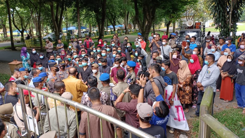 BBSNews.id – Stabat – Warga yang tergabung Forum Konsultasi Masyarakat Wampu (FKWM) menggelar unjukrasa ke kantor Bupati menuntut agar lahan kosong milik PT LNK di Desa Stabat Lama Kecamatan Wampu untuk dijadikan fasilitas umum (Fasum) lapangan bola kaki, Jumat (1/4/2022).