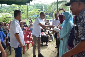 Wakil Ketua DPRD Kabupaten Langkat, Dr. Donny Setha, ST. SH. MH memberikan bantuan pribadi berupa beras 5 kg kepada warga yang mengikuti reses di Dusun I Desa Alur Cempedak Kecamatan Pangkalan Susu, Langkat, Kamis (7/9/2023). (Foto Dok/ Ist)