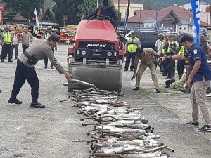 DIMUSNAHKAN: Polres Taput memusnahkan 568 knalpot blong selama berlangsung operasi keselamatan di Polres Taput pada deklarasi tertib berlalu lintas dalam rangka menyambut HUT Lalu Lintas ke 68, Senin (25/9/2023) yang digelar di Terminal Tarutung. (Foto BBSNews.id/Posma Simorangkir)
