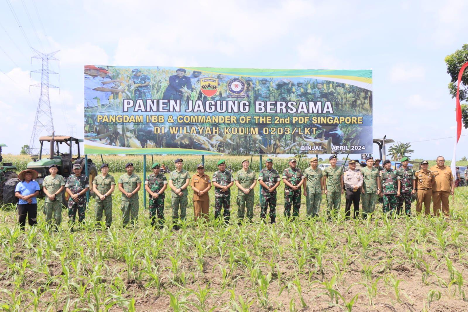 PANEN RAYA JAGUNG: Asisten Administrasi dan Umum Meidy Yusri bersama Kasdam I/BB Brigjen TNI Refrizal dan Commander Of 2ND People Defence Force AD Singapura dalam rangka panen jagung dukung program ketahanan pangan nasional di Jalan Diponegoro Kelurahan Tunggurono Kecamatan Binjai Timur Kota Binjai, Selasa (23/4/2024). (Foto dok/ Diskominfo Binjai)
