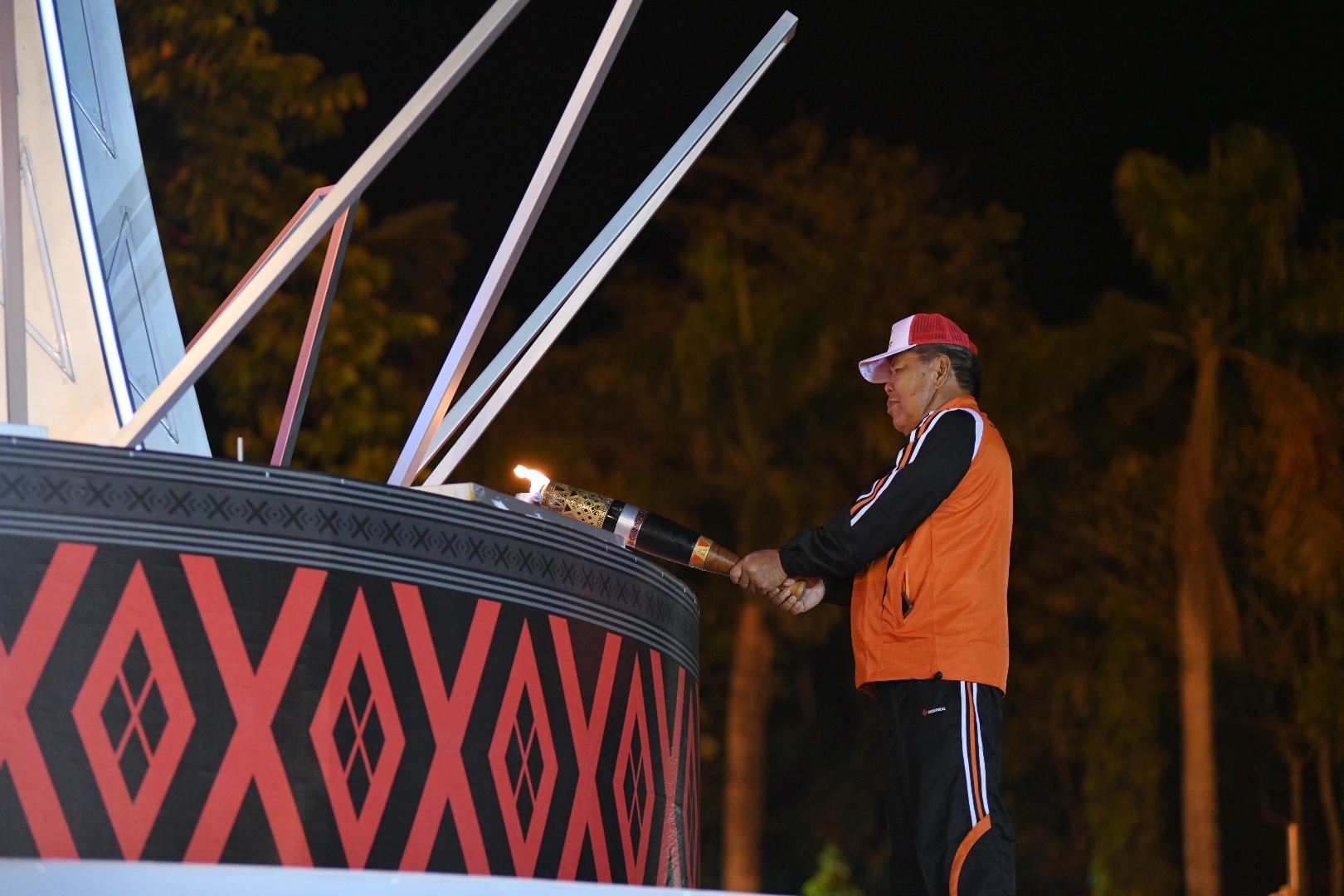 Di saat itu, suasana stadion pun senyap lantaran perhatian diberikan pada Samsul yang sudah berdiri di depan kaldron. Lantas Ia pun menyulut kaldron. Sejurus kemudian muncul api besar di atas kaldron. Pemandangan itu pun disambut meriah para penonton.