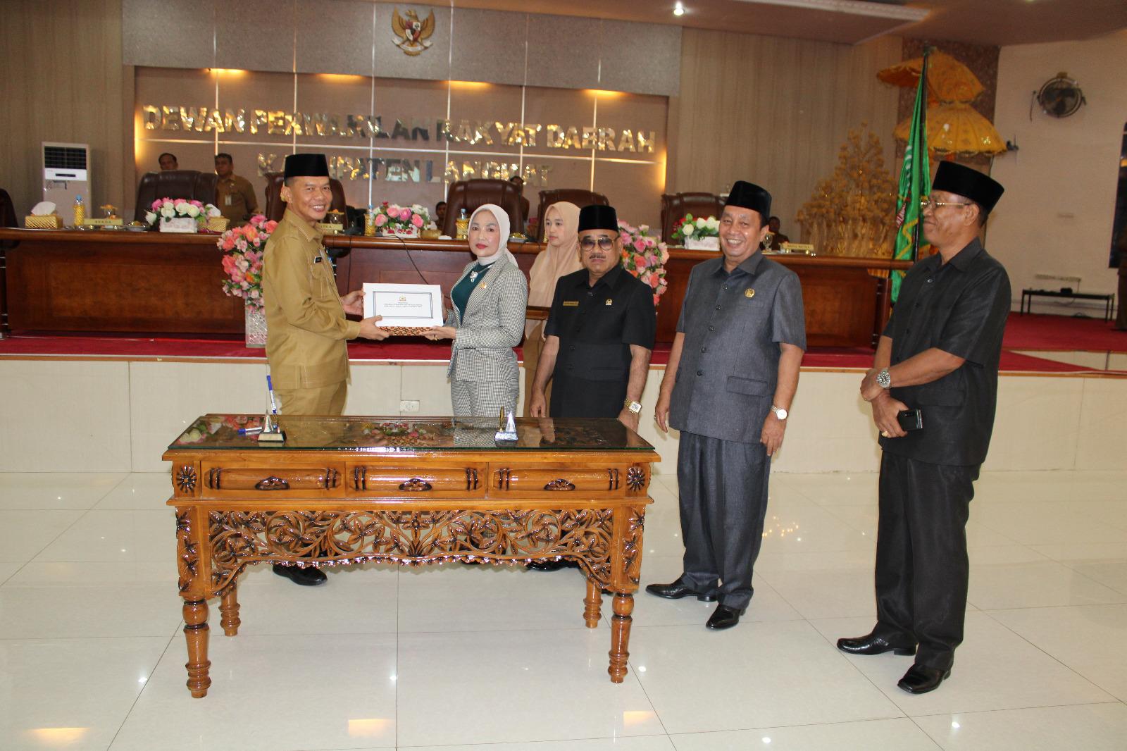 TANDATANGANI: Ketua DPRD Langkat dan Sekda Langkat menandatangani Berita Acara penyerahan Ranperda APBD Langkat TA 2025 di DPRD Langkat Stabat, Senin (25/11/2024).(Foto / Sekwan Lkt).