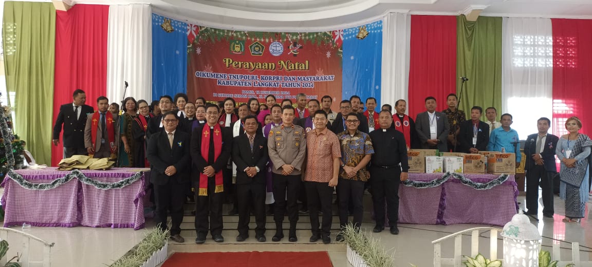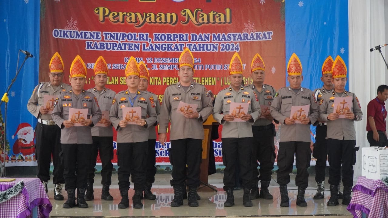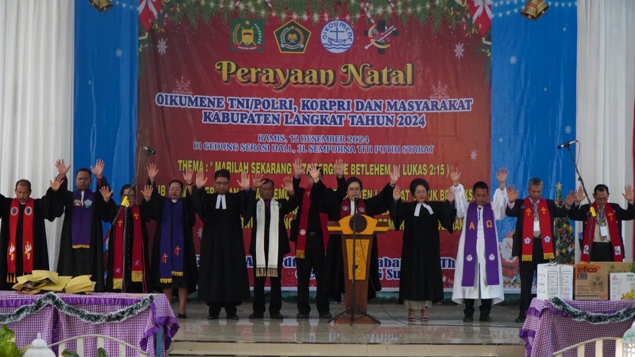 BBSNews.id – Langkat – Perayaan Natal Oikumene TNI/Polri/Korpri dan Masyarakat Kabupaten Langkat Tahun 2024 mengusung tema “Marilah sekarang kita pergi ke Betlehem (Bdk. Lukas 2:15)” dengan subtema “Perayaan Natal Memotivasi Umat Kristiani Langkat Untuk Bersaksi Melalui Ibadah, Kata dan Karya di Tengah Masyarakat Agar Terwujud Langkat yang Religius, Bermartabat, Toleran dan Harmonis.” berlangsung meriah di Gedung Serasi Hall, Jalan Sempurna Titi Putih, Kelurahan Perdamaian, Stabat, Kamis (12/12/2024).
