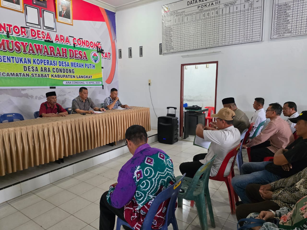 MUSYAWARAH DESA : Desa Ara Condong Kecamatan Stabat, Kabupaten Langkat, dipimpin Kades Hasan Basri , S.Ag MH, memimpin Musyawarah Desa membentuk Koperasi Desa Merah Putih di Desanya baru baru ini. (Foto dok/DesaAra Condong).