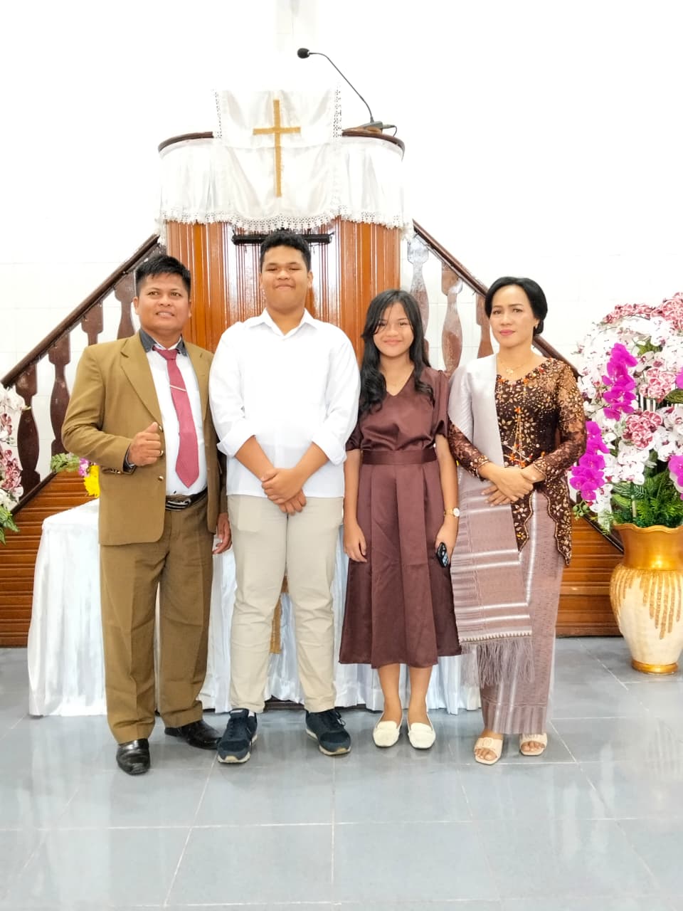 FOTO BERSAMA : Bibv.Tinorpa Sihombing foto bersama keluarga usai serah terima kepada penggantinya di HKBP Ressort Tegal Rejo Jln Sehati 149 Medan Perjuangan Minggu (26/4)⁰